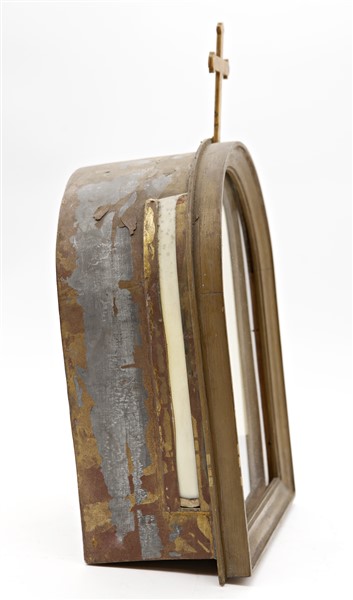 Gruppo di tredici diorami raffiguranti le stazioni della Via Crucis con teche in metallo contenenti oleografie sagomate applicate su lamierino (cm tot 22x39x13) (difetti e mancanze)