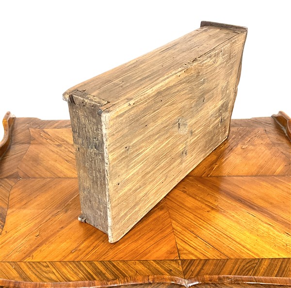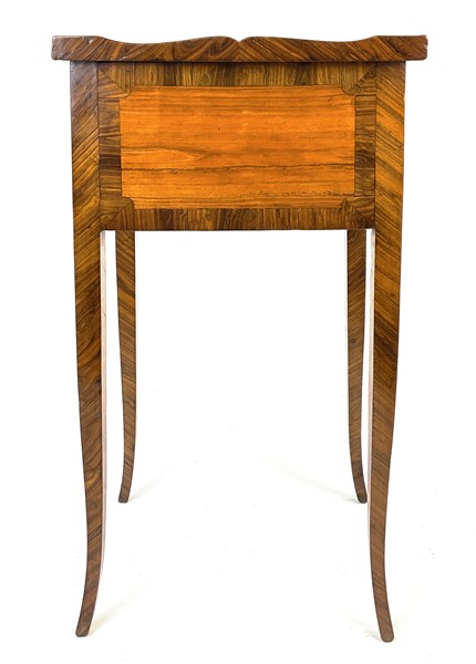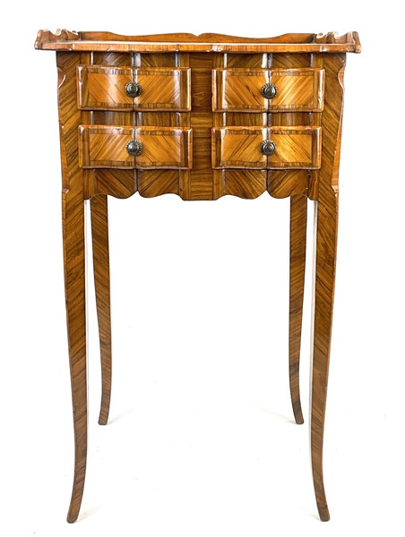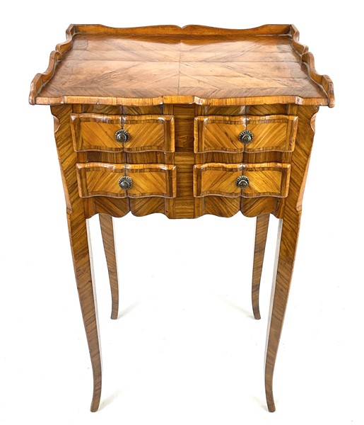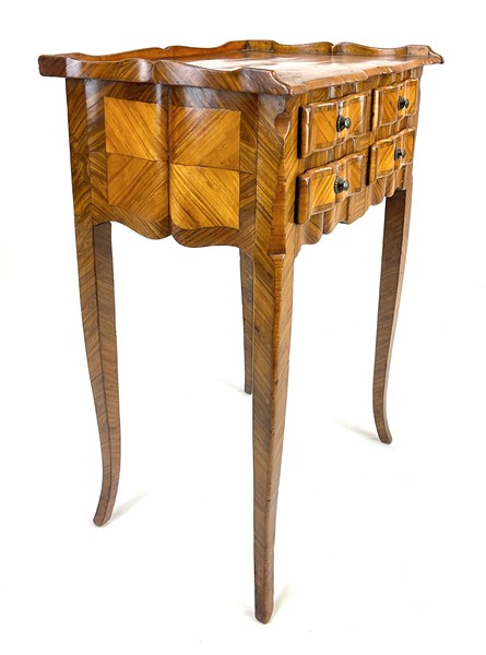 Mobiletto da centro lastronato in legni vari con fronte a quattro cassettini e gambe mosse. Secolo XIX (cm 44x75x34) (difetti e restauri)