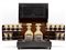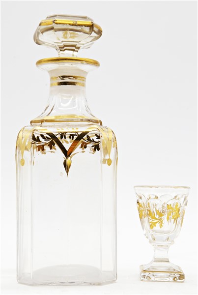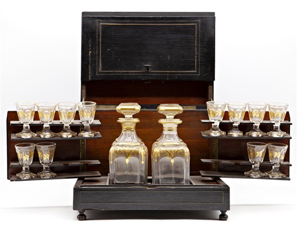 Porta liquori del tipo "cave a liqueur" in legno ebanizzato con profili in ottone, contenente quattro bottiglie e dodici bicchierini in vetro con decori dorati. Fine secolo XIX (cm 32x27x24) (difetti e mancanze)