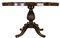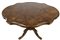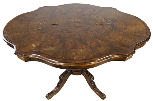 Tavolo con piano sagomato in legno massello e lastronato a decoro geometrico, fusto e gambe intagliate a motivi fogliacei (cm 144x78x111) (difetti e mancanze)