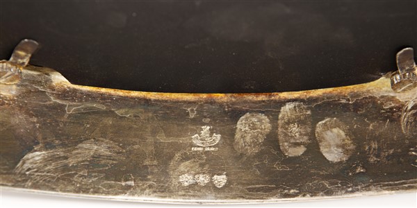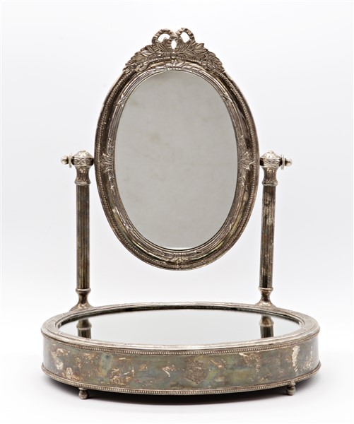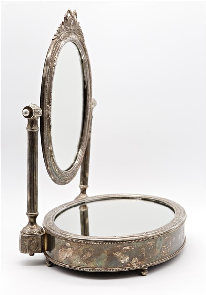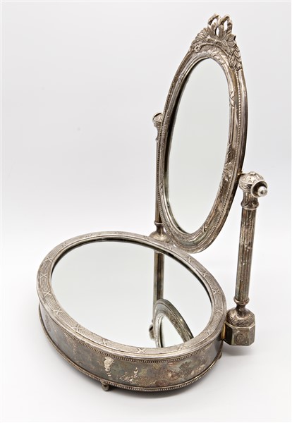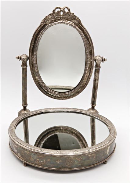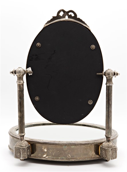 Specchiera da toilette in old sheffield con base ovale specchiata, sostegni scanalati cimasa a nastro e bordure perlinate, specchio basculante. Monogramma inciso sul fronte. Inghilterra, inizio secolo XX (h cm 46) (lievi difetti)