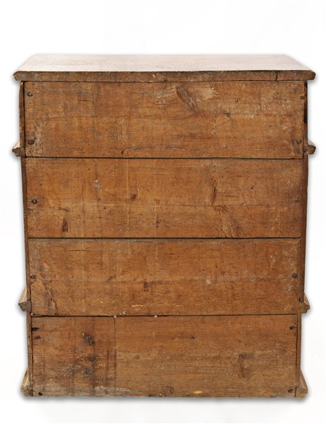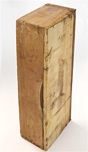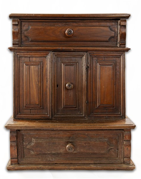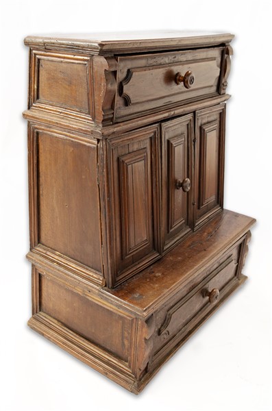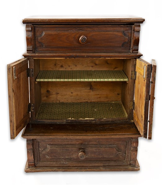 Inginocchiatoio in noce con fronte ad un anta e doppia lesena incernierata, due cassetti e bordure scanalate, pomoli torniti. Secolo XVIII ( 76x90x45) (difetti e modifiche)