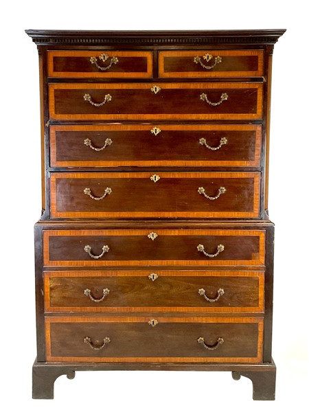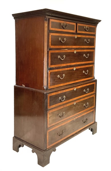 Mobile cassettiera a due corpi impiallacciato in mogano e filettato in legni vari, fronte a otto diversi cassetti di cui due piccoli allineati nella parte superiore, piedi a mensola e bordura dentellata. Inghilterra, fine secolo XIX (cm 119x177x59) (difetti)
