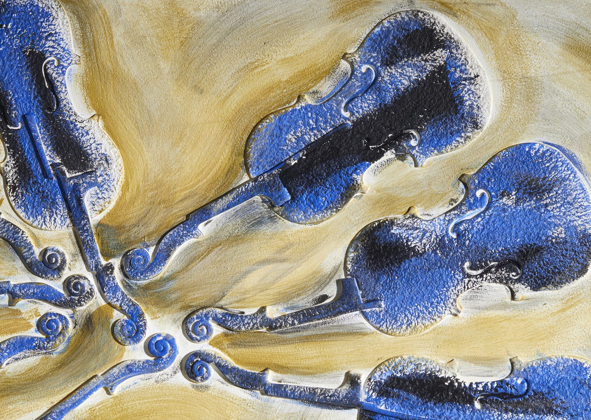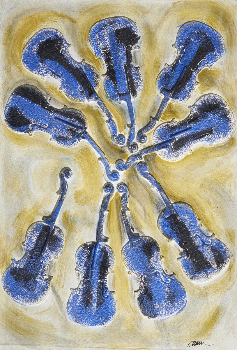 ARMAN FERNANDEZ (1928 - 2005) SENZA TITOLO (VIOLONS BLEUS), 2003. pittura acrilica e cartapesta su tavola. Cm 101,60 x 151,10. firma.