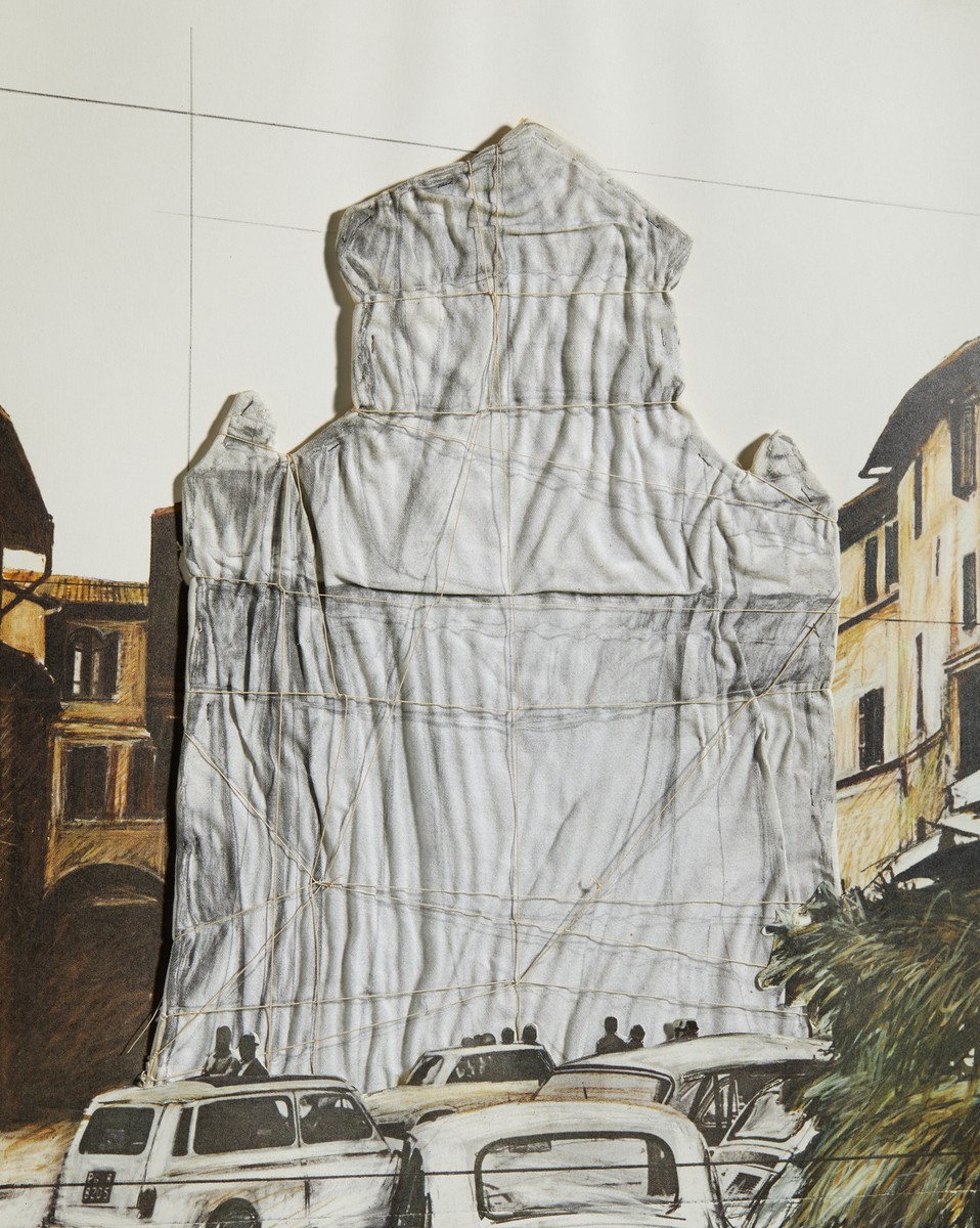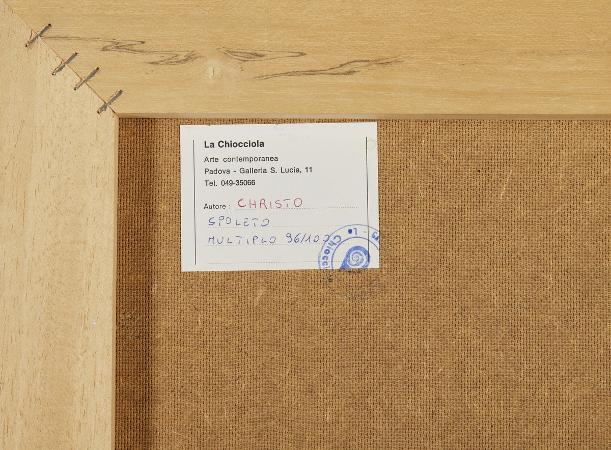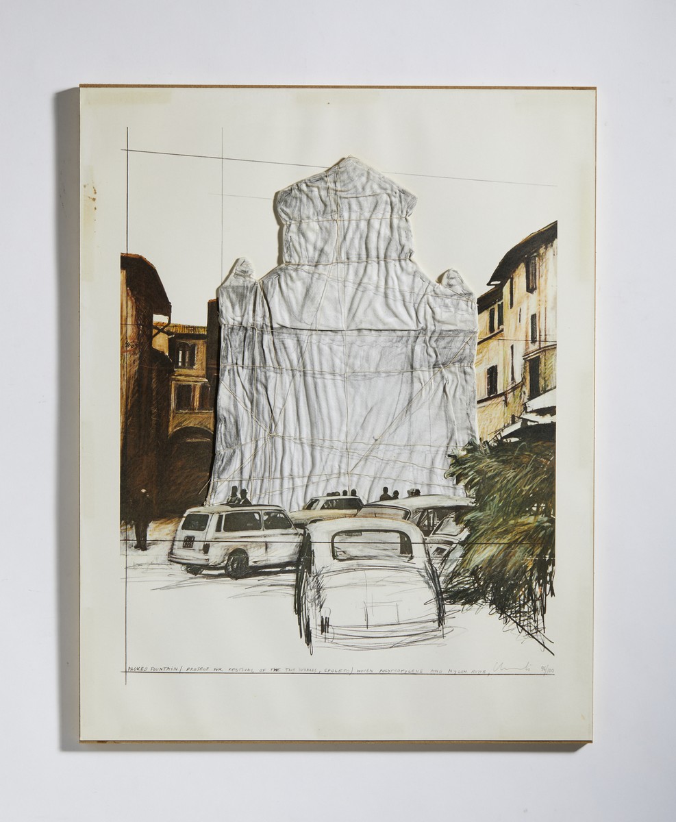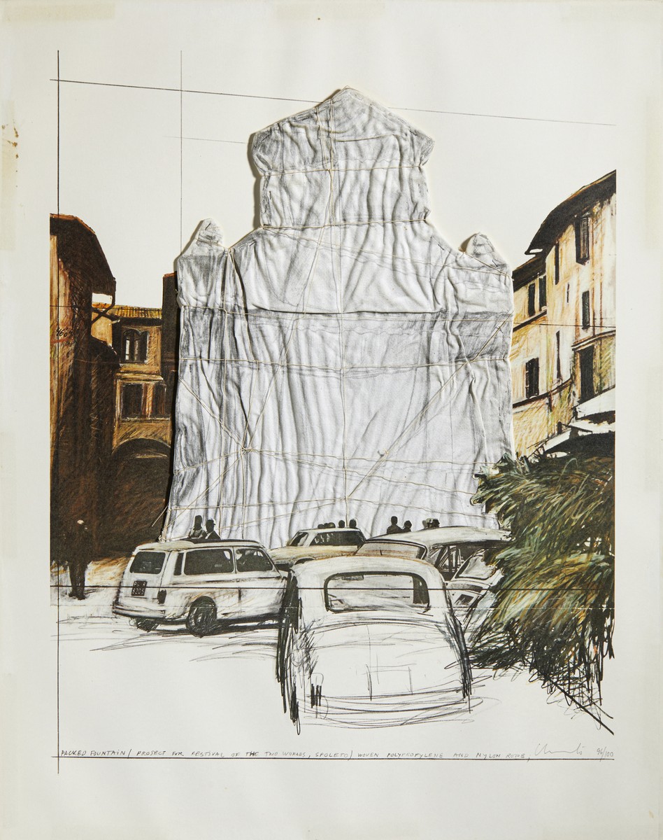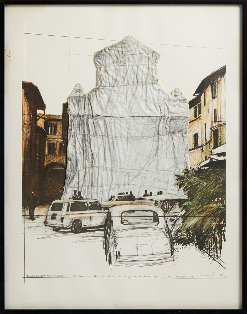 CHRISTO' (n. 1935) & JEANNE-CLAUDE (1935 - 2009) WRAPPED FOUNTAIN AND WRAPPED TOWER, SPOLETO, 1968, 1972. serigrafia con collage di stoffa, spago e graffette, montata su tavola su carta Fabriano.. Cm 65,00 x 82,40. firma e tiratura a matita, es. 96/100