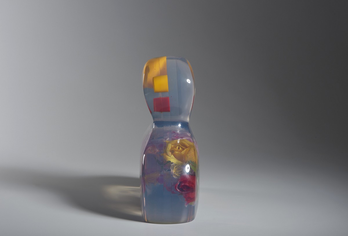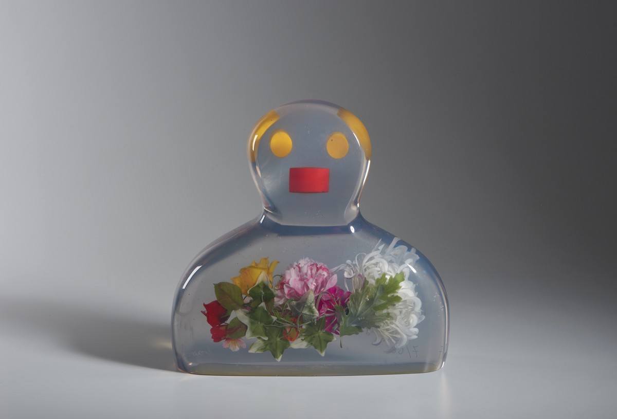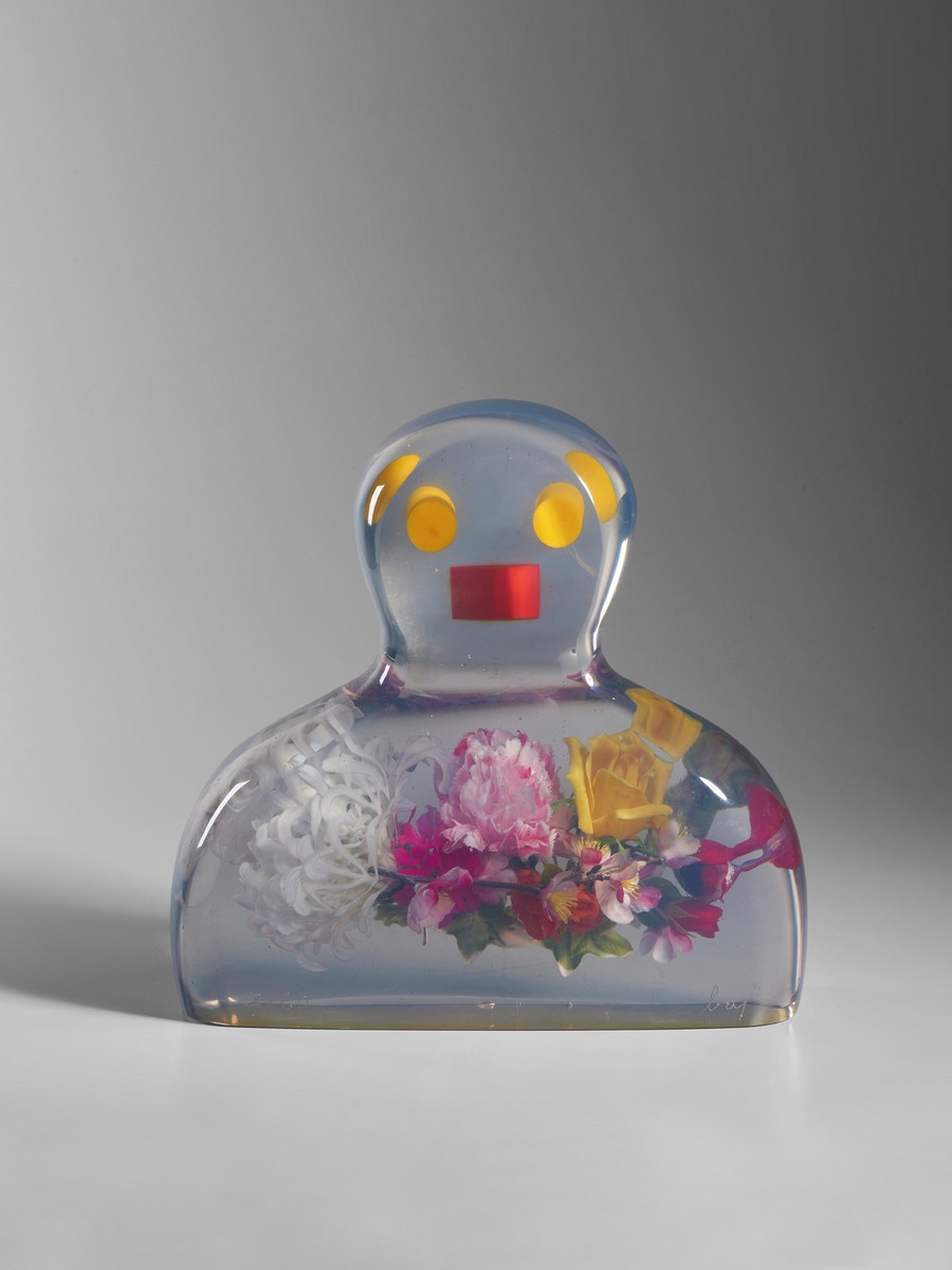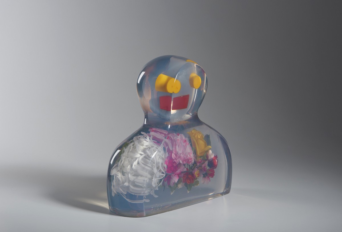BAJ ENRICO (1924 - 2003) LA DAMA DI FIORI, 1985. resina poliestere e fiori di plastica. Cm 43,00 x 38,00 x 15,00. firma e tiratura incise alla base, es. 7/60