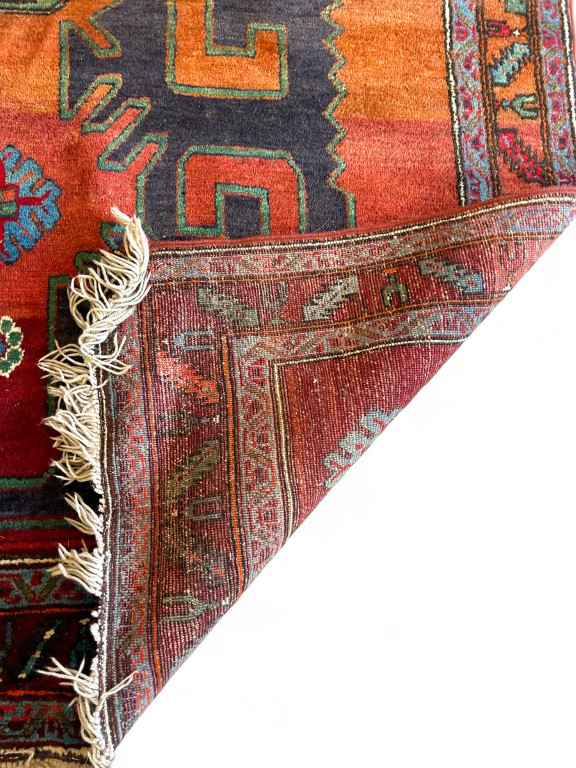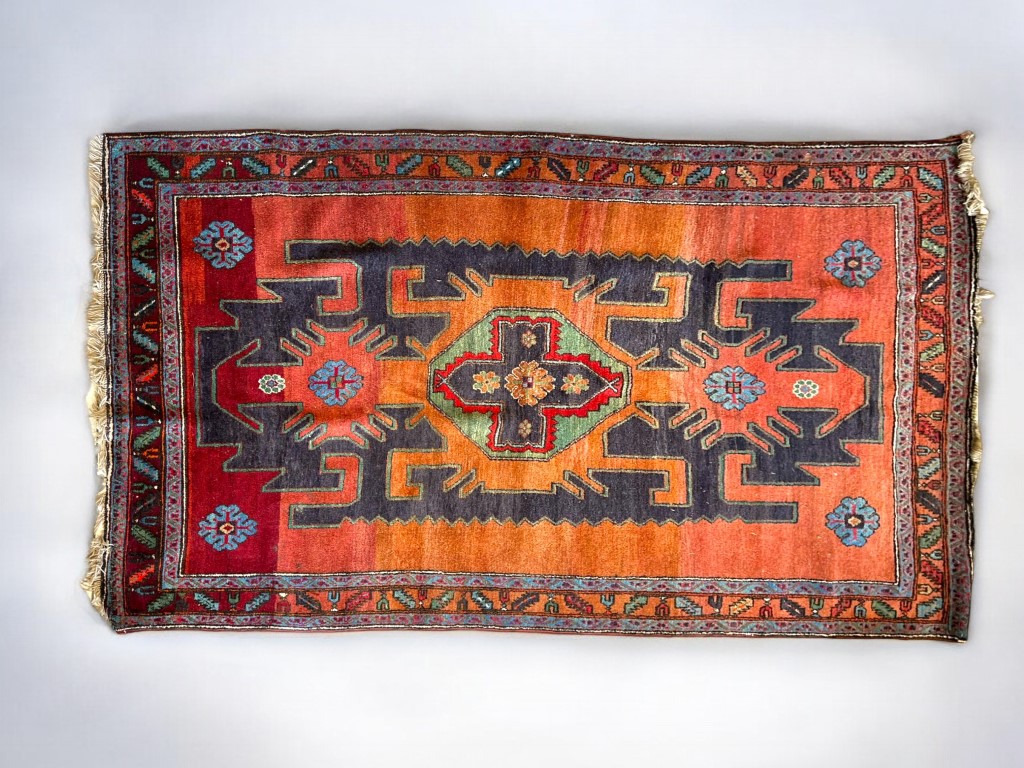 Tappeto caucasico a motivi geometrici su fondo arancio