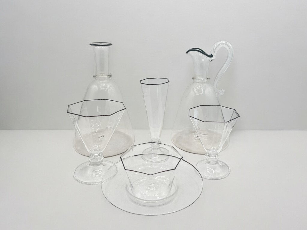 con bordo scuro composto da: una bottiglia ed una caraffa, dodici coppette da macedonia con dodici piattini, sette flutes, due bicchieri da acqua e quattro da vino (39)