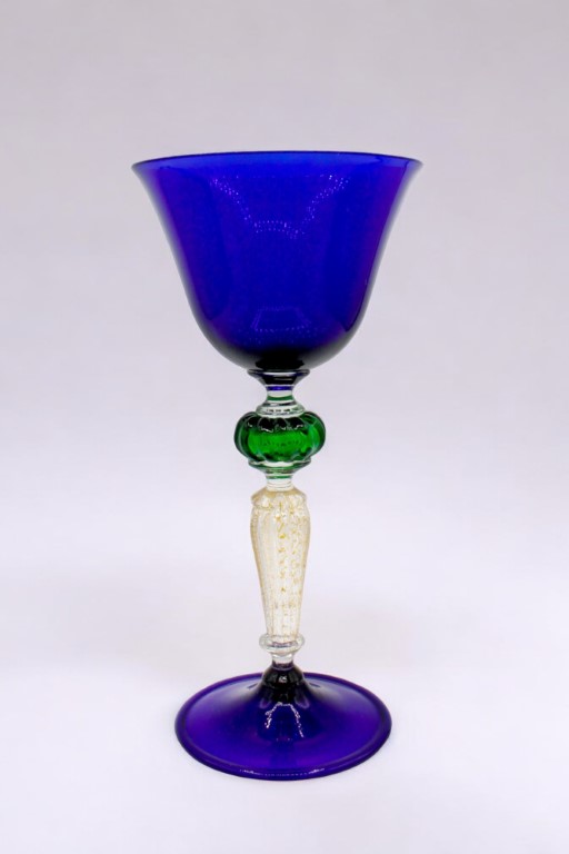Calice in vetro di Murano blu con stelo in vetro pulegoso con nodo in verde Alt. cm 19