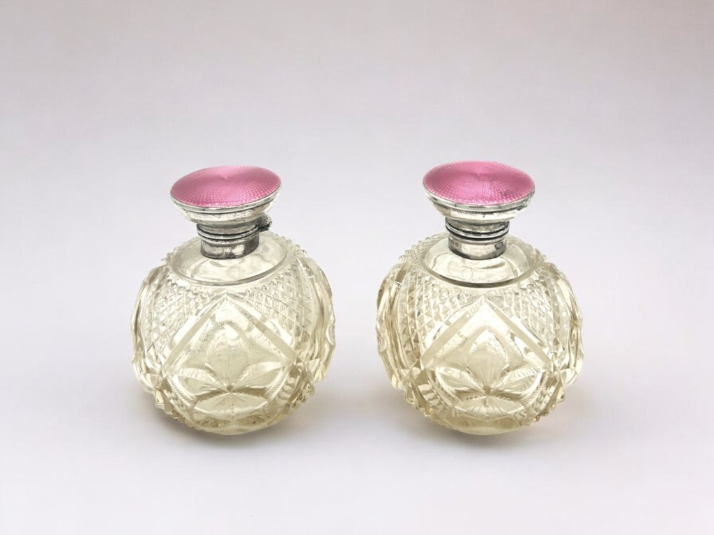 Due bottiglie da profumo in cristallo intagliato con tappi in argento e smalto