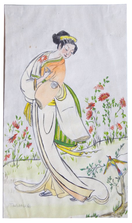 Disegno cinese su carta raffigurante fanciulla con firma dell'autore