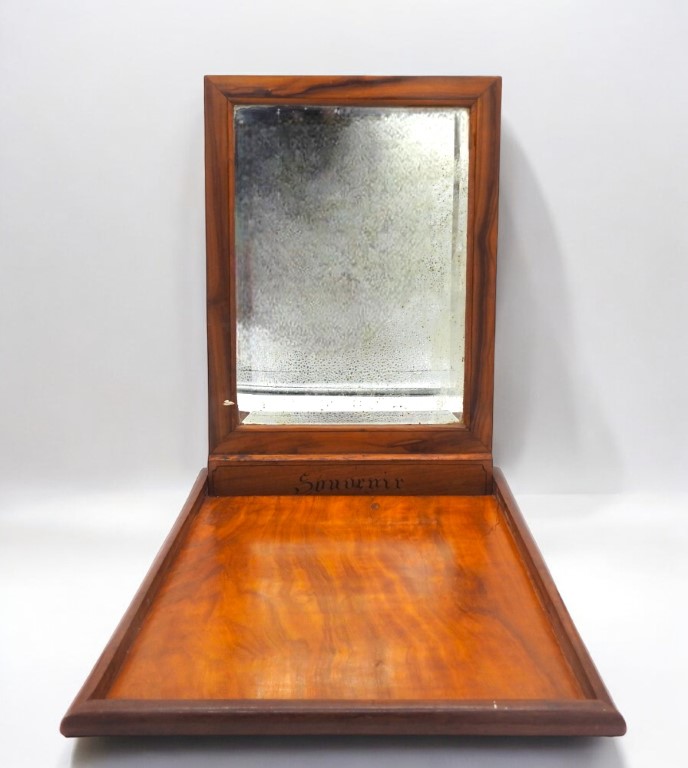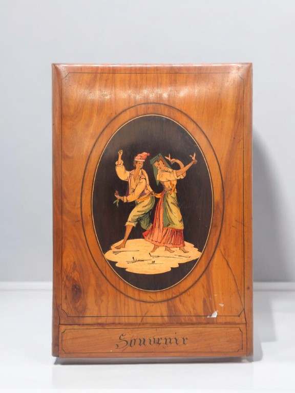 in olivo intarsiato in altre essenze con due popolani che danzano e la scritta SOUVENIR