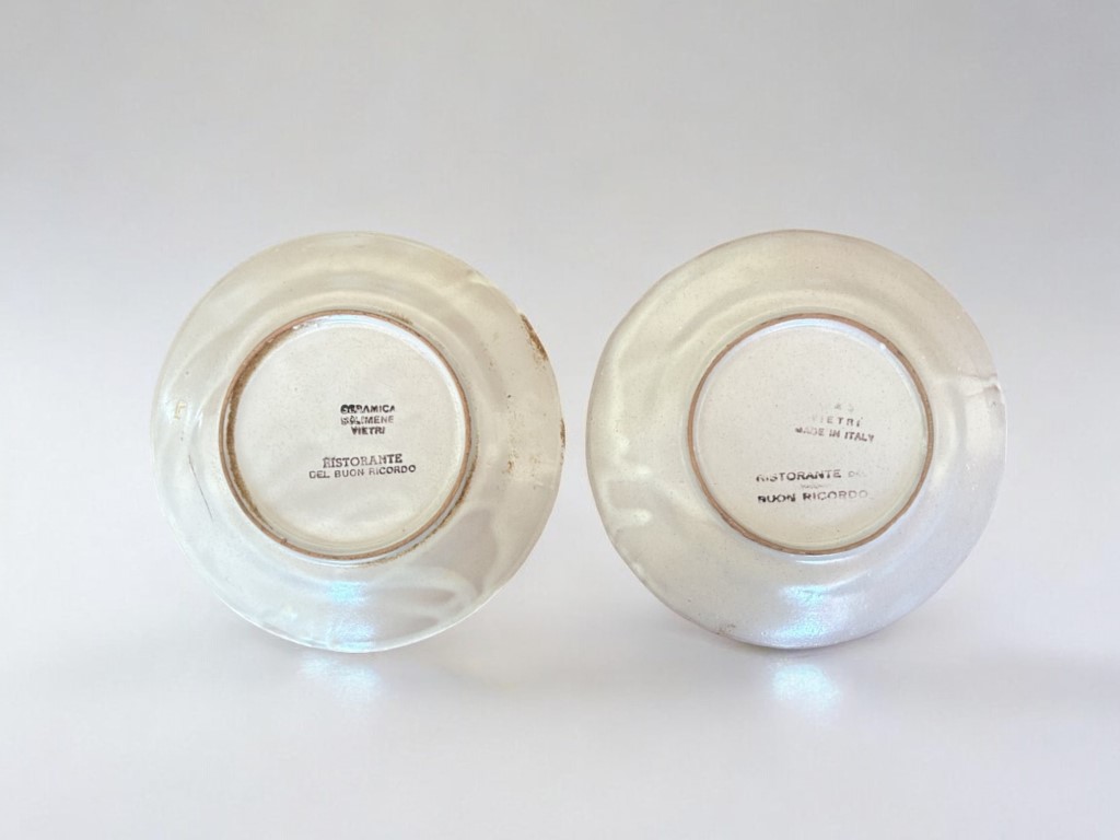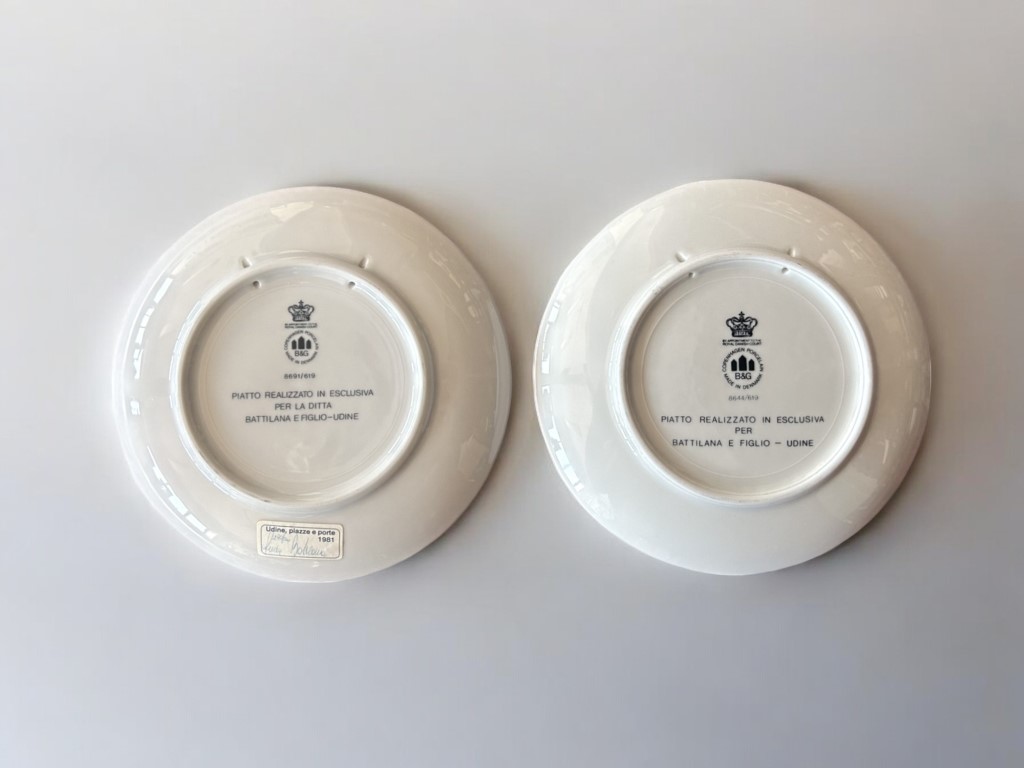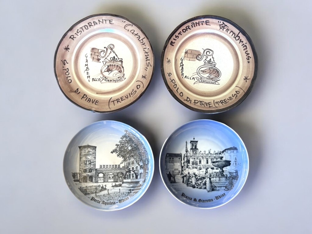 Lotto di piattini composto da: Due piatti del Buon Ricordo in maiolica, e due piatti ricordo di Udine in porcellana