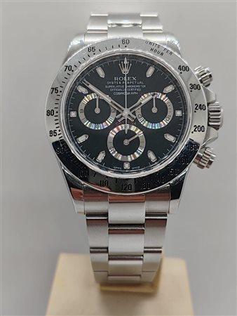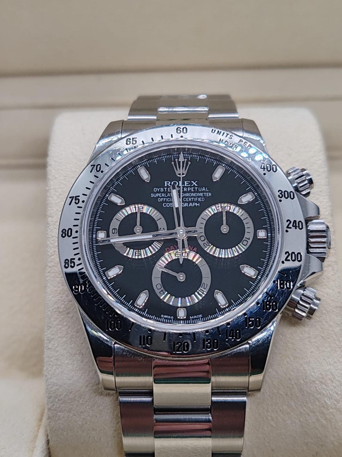 Marca Rolex Modello (Orologio) Daytona APH chromalight Numero di referenza 116520 Carica Automatico Materiale della cassa Acciaio Materiale cinturino Acciaio Anno di produzione 2014 Condizione Usato (Ottimo) documenti originali, no box Materiale della cassa Acciaio Diametro 40 mm Impermeabile 10 ATM Materiale lunetta Acciaio Vetro Vetro zaffiro Quadrante nero Numeri sul quadrante Senza numeri Cinturino Materiale cinturino Acciaio Colore cinturino Acciaio Chiusura Déployante Materiale chiusura Acciaio