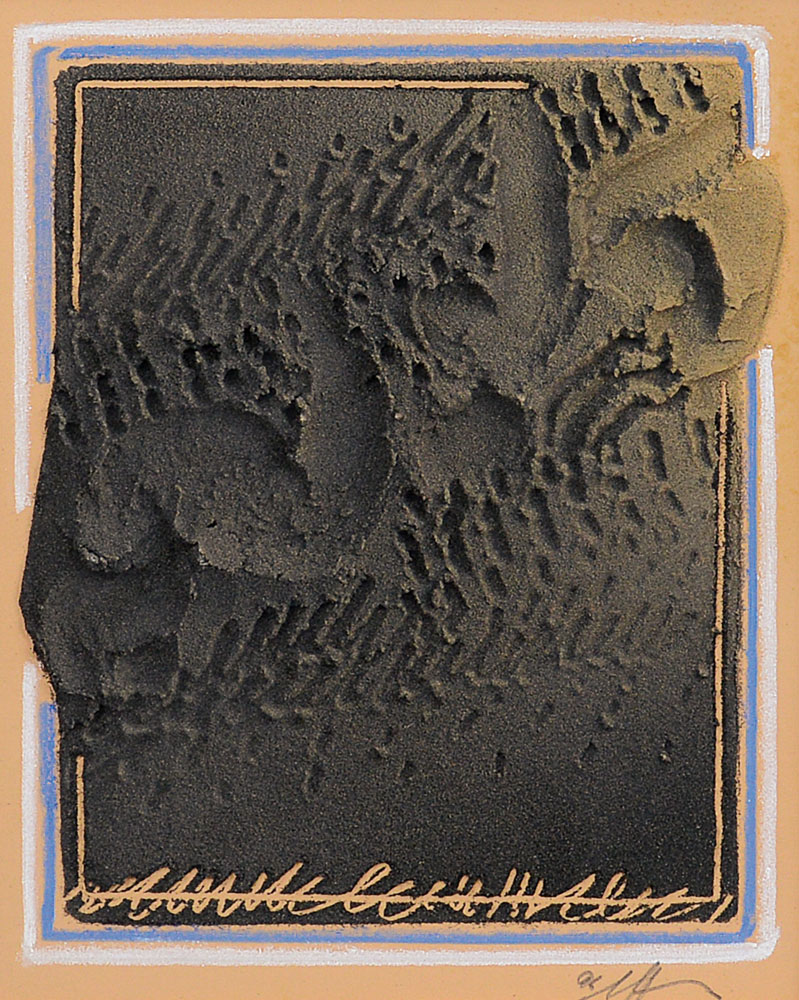 tecnica mista e sabbia su cartone cm. 36x26, firma e anno in basso a destra, etichetta dell'artista al retro.
