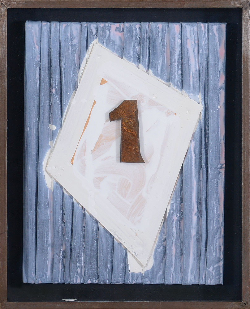acrilico bianco su cartone vegetale più lamina di piombo cm. 37x29, firma, anno etichetta e timbri della Galleria d'Arte Sant'Erasmo (MI) al retro, autentica dell'artista, etichetta e timbri della Galleria d'Arte Sant'Erasmo (MI) su foto.