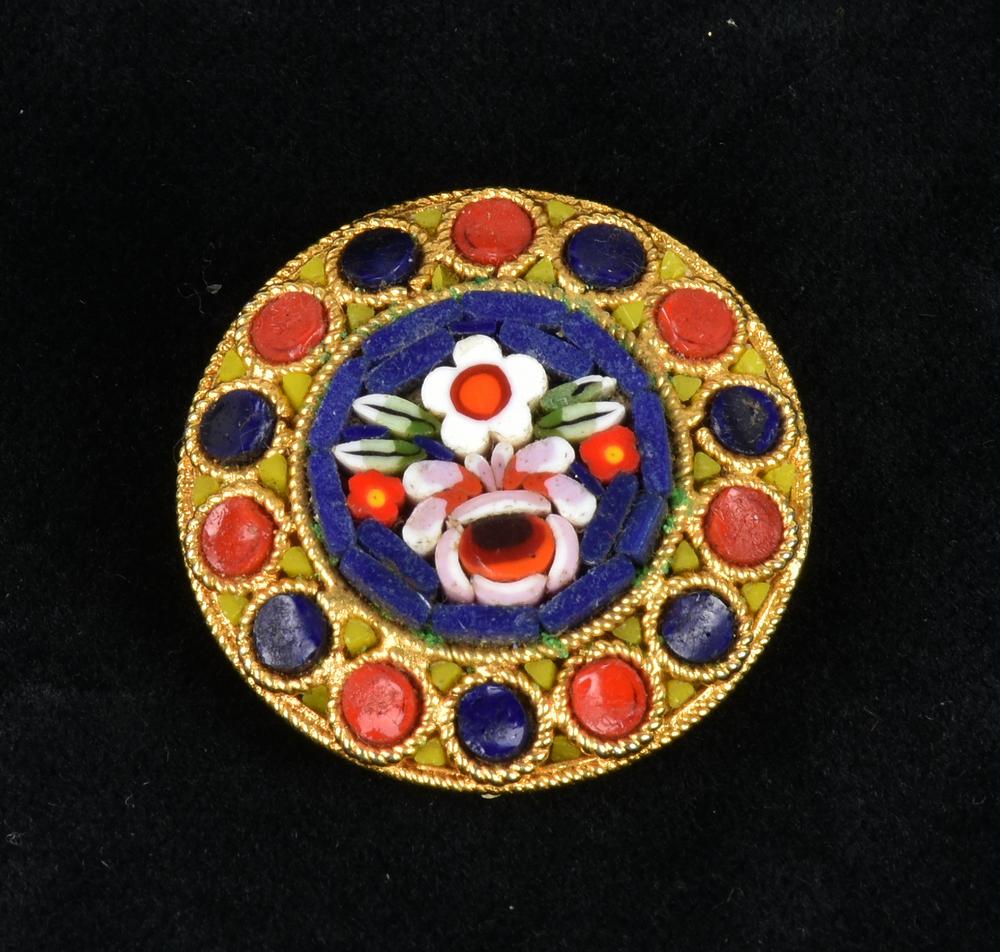 SPILLA IN METALLO DORATO CON MICRO MOSAICO raffigurante mazzo di fiori...