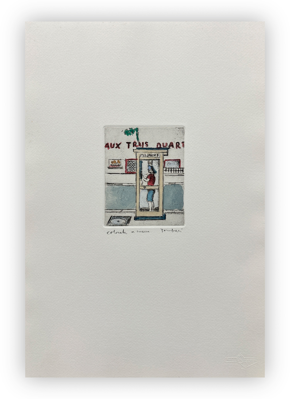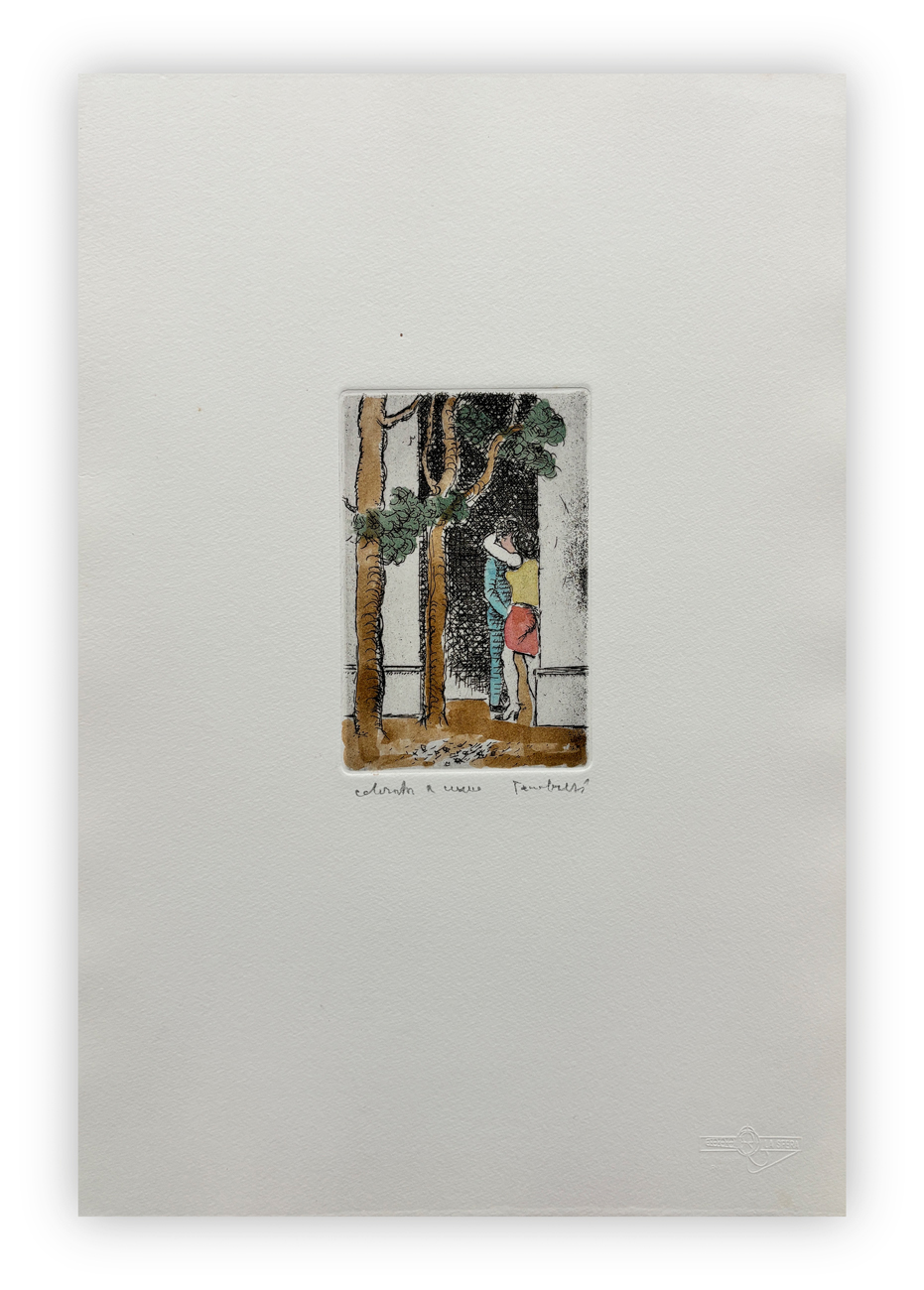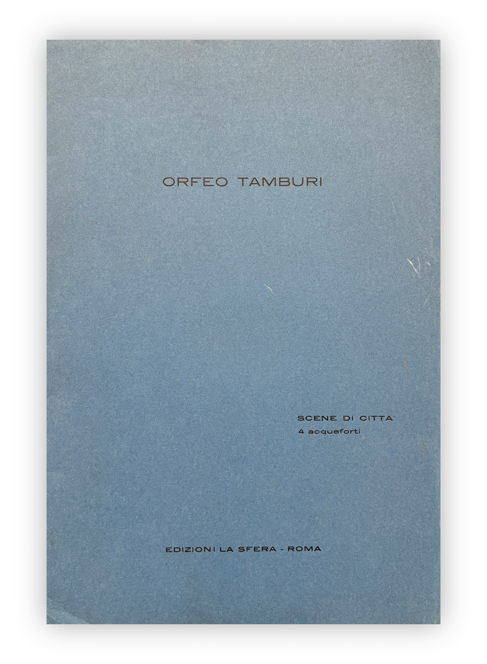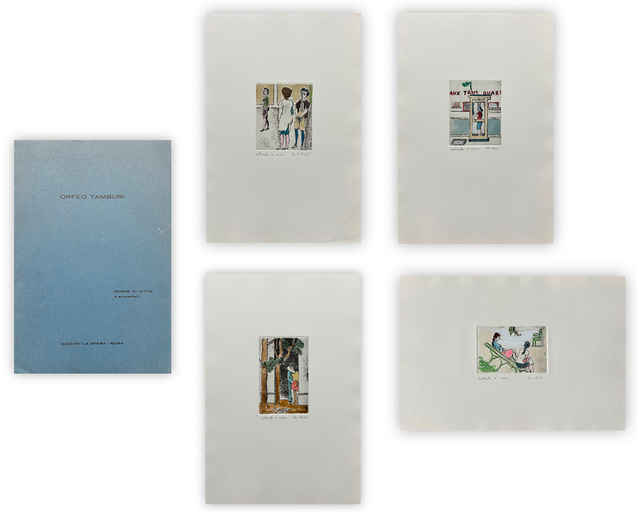 Cartella contenente 4 acqueforti colorate e mano di Orfeo Tamburi, ciascuna recante firma e iscrizione 'Colorata a mano' a matita al fronte e timbro a secco dell'Editore
