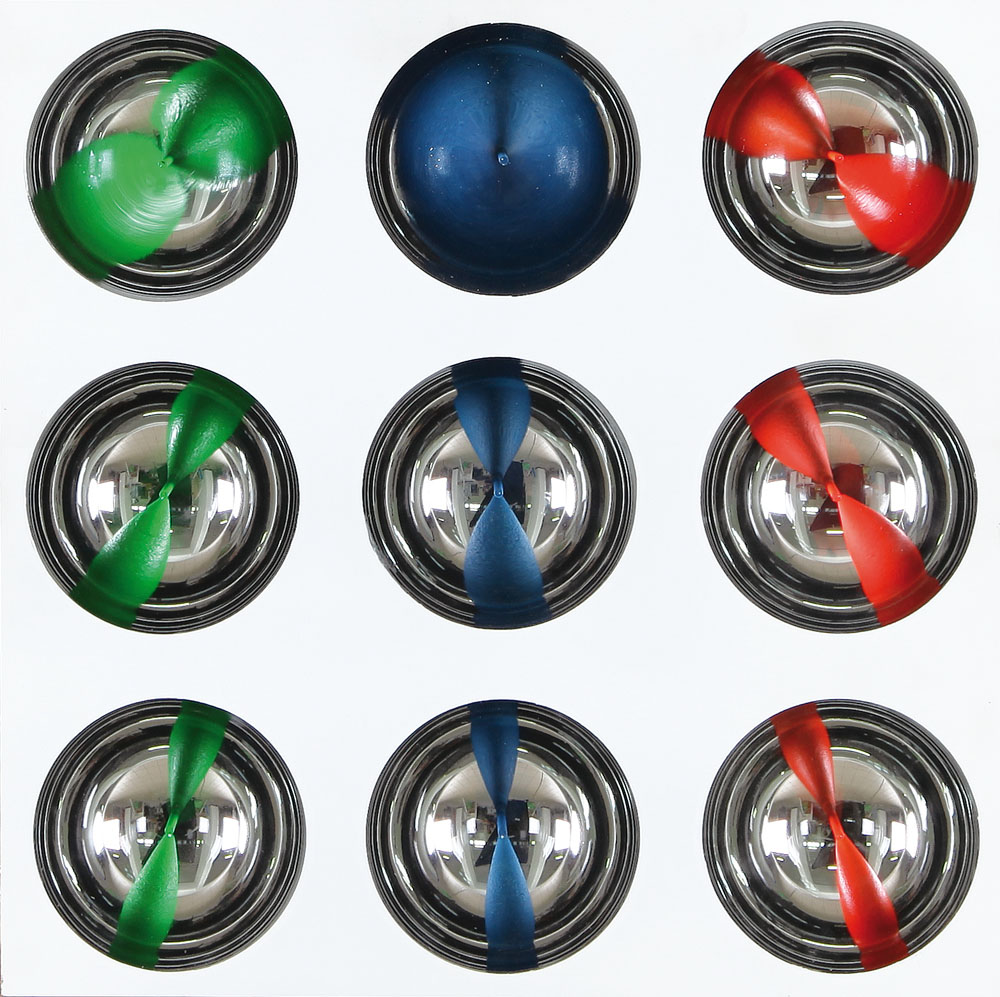 assemblaggio di materie plastiche (9 semisfere) cm. 47x47x7,5; firma e titolo al retro, dichiarazione d'autenticità dell'artista e timbro della Anti Galleria d'Arte (Mestre-VE) su foto, opera priva di cornice.