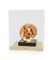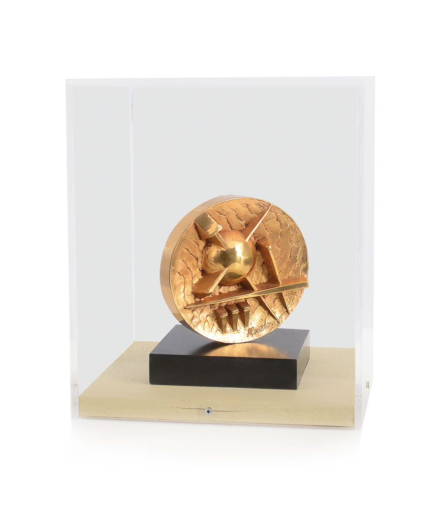 scultura in bronzo dorato diametro cm. 10x1,5; esemplare 200/250, firma in basso sulla destra, entro teca in plexiglass cm. 21x17x17.