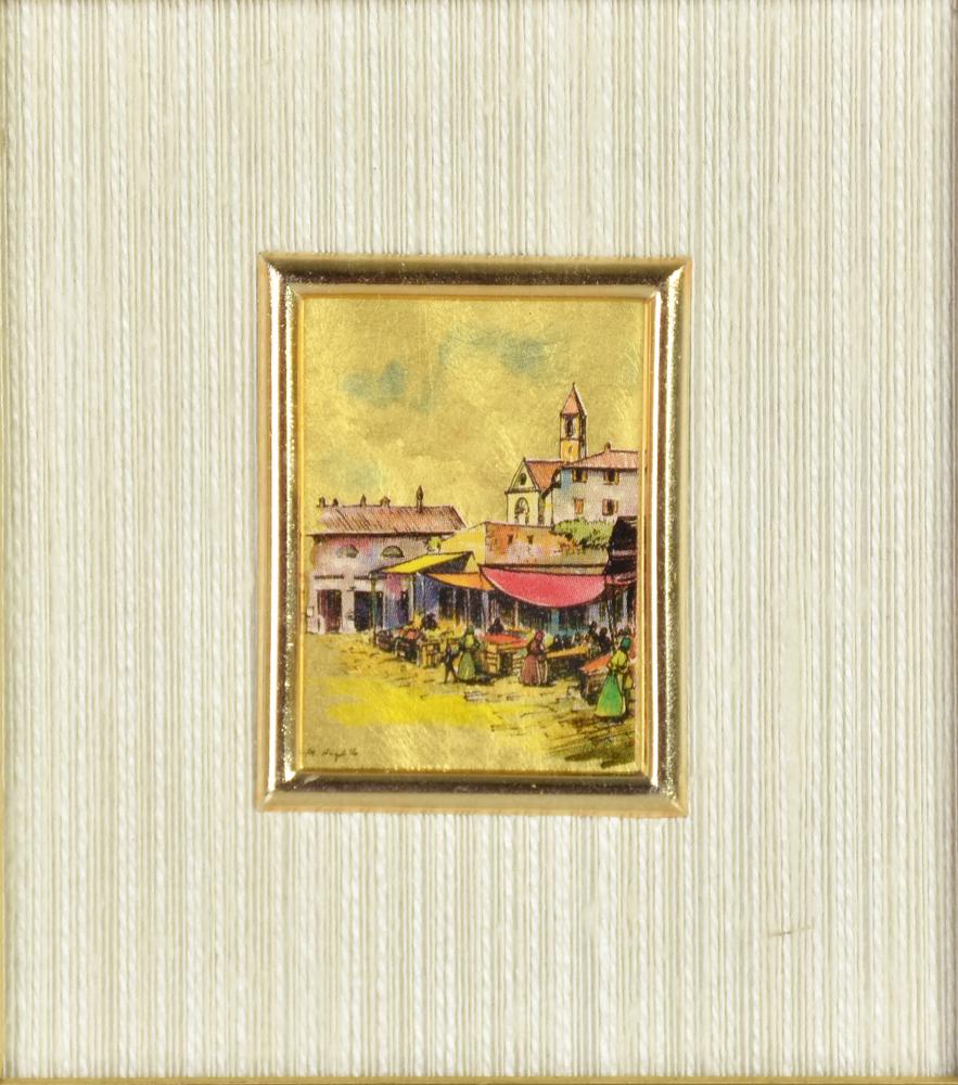 Ignoto PAESAGGIO CITTADINO cromolitografia su lastra dorata, cm 4x3 firma