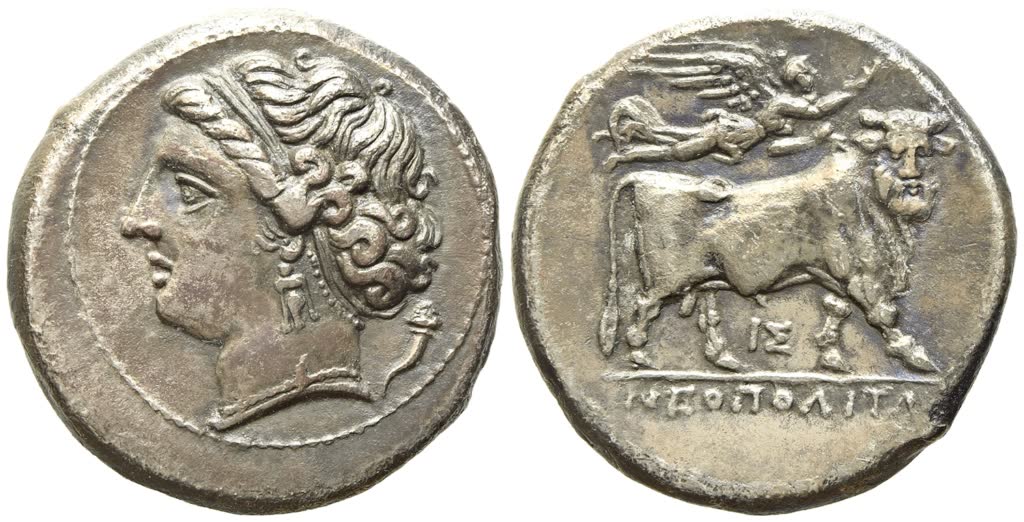 Head of nymph to left, wearing pendant earring and pearl necklace; cornucopia behind; Rv. Man-headed bull walking to right, head facing, crowned with wreath by Nike flying above to right; ΙΣ below, ΝΕΟΠΟΛΙΤΩ[Ν] in exergue. HN Italy 586; SNG BnF 856; SNG ANS 410. Fine style. Near extremely fine.