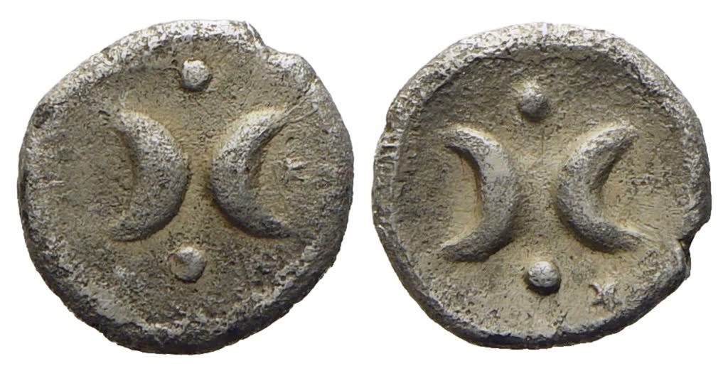 Two crescents back-to-back; four pellets around; Rv. Two crescents back-to-back; two pellets around. HN Italy 982; Vlasto 1758-88. Near extremely fine.