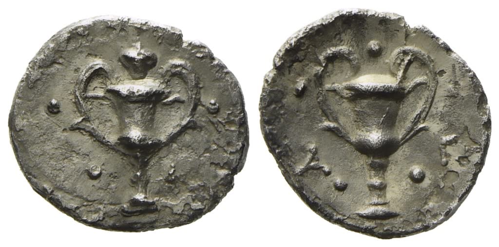 Kantharos; pellets and star in field, Rv. A-Γ, kantharos surrounded by five pellets. Vlasto 1628 (this coin); HN Italy 1076. Porosity. Extremely fine.