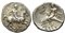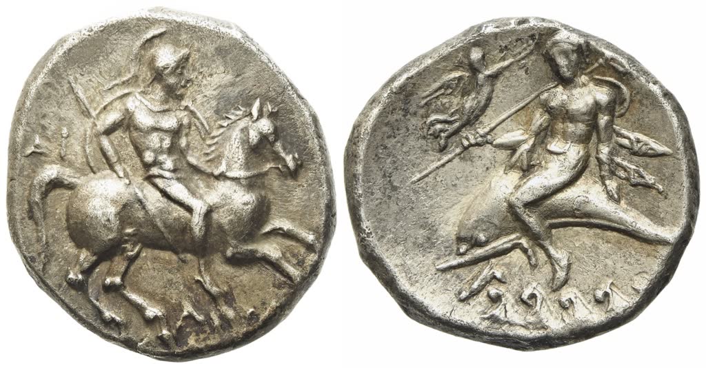 Di- and Apollonios, magistrates. Warrior, wearing a lorica and a crested helmet, holding a lance in his right hand and a large round shield in his left, on horse galloping to r.; to left, ΔI; below, AΠOΛ [ΛΩNIOΣ]; Rv. [TAPAΣ], Taras riding dolphin to l., holding trident over right shoulder and being crowned with wreath by Nike flying towards him; below, waves. HN Italy 1038; SNG ANS 1216; Vlasto 894. Extremely fine. Refined style.