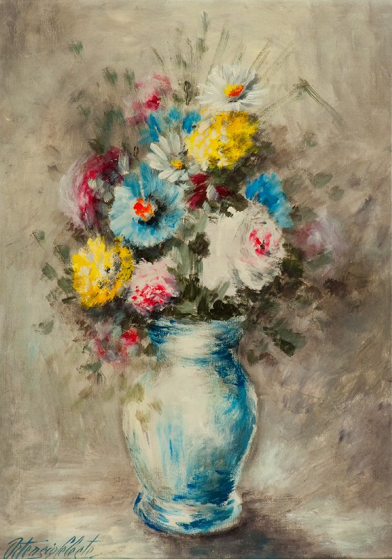 Ortensia Celeste (Asti 1919) FIORI CON VASO, 1975 Olio su cartone, cm. 70x50 Firmato in basso a sinistra. Autentica dell'Artista su foto.