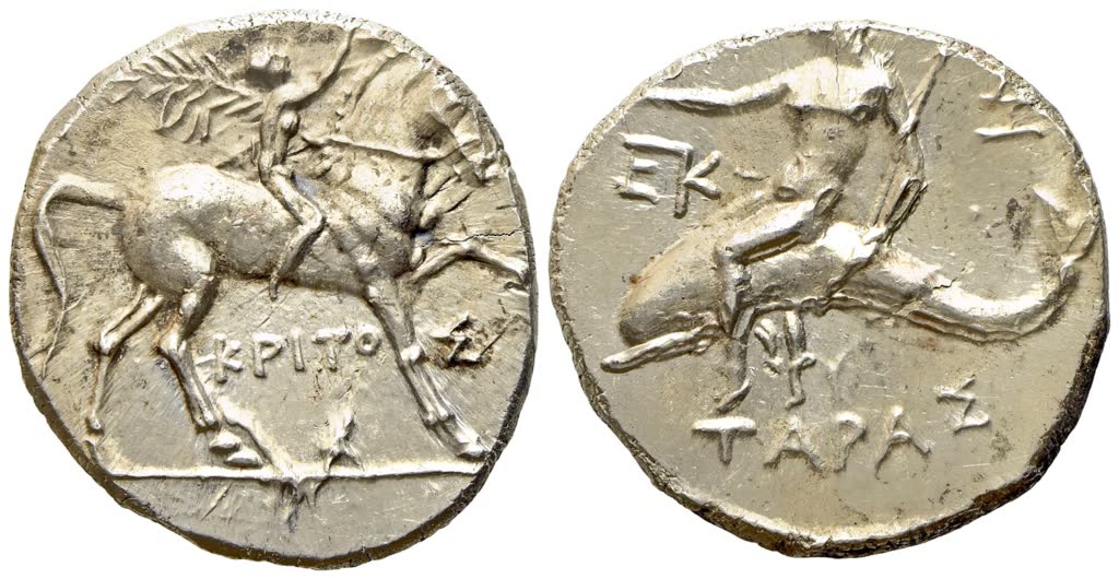 Ek-, Zo-, and Kritos, magistrates. Nude youth, crowning horse with laurel wreath in his right hand, left hand holding filleted palm frond over shoulder, riding horse r.; KPITO-Σ below, Rv. Taras, cradling trident in left arm, holding in extended right hand, Nike, who crowns him with wreath held in both hands, astride dolphin left; EK monogram to left, ZΩ monogram to right; TAPAΣ below. Vlasto 978–80; HN Italy 1080; SNG ANS 1269. Extremely fine.