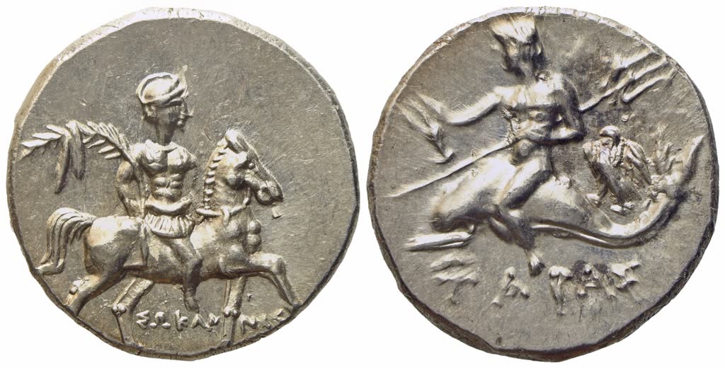 Sokannas, magistrate. ΣΩKAN-NAΣ, warrior on horseback r., holding filleted palm frond in his right hand, Rv. ΤΑΡΑΣ, youthful oikist, nude, riding dolphin to left, holding kantharos in his right hand and trident in his left; to right, eagle with spread wings standing left. HN Italy 1082; Vlasto 984. Near FDC.