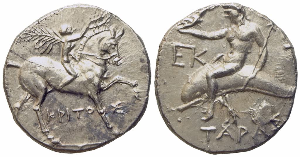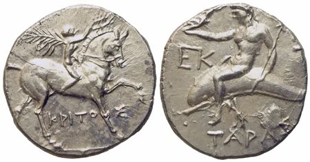 Nude youth, crowning horse with laurel wreath in his right hand, left hand holding filleted palm frond over shoulder, riding horse right; KPITOΣ below, Rv. Taras, cradling trident in left arm, holding in extended right hand, Nike, who crowns him with wreath held in both hands, astride dolphin left; EK monogram to left, [ZΩ]. Vlasto 978–80; HN Italy 1080; SNG ANS 1269. Flan crack at 10 o'clock, otherwise good extremely fine / near FDC.