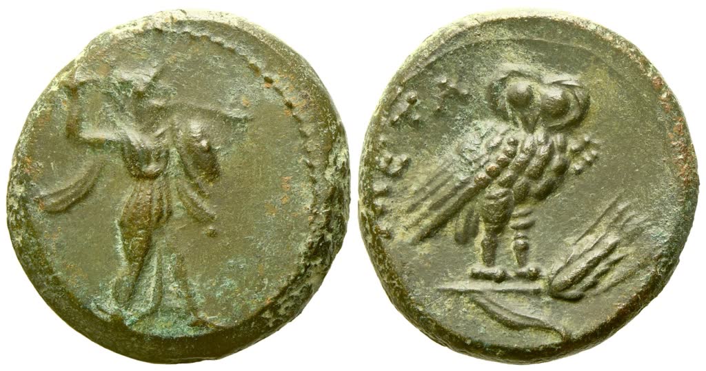 Athena Promachos advancing to right, brandishing spear and shield; Rv. Owl standing on grain ear to right, head facing; META upwards to left. Johnston, Bronze 68a; SNG Copenhagen 1254; HN Italy 1704; HGC 1, 1113. Olive green patina. Good extremely fine.