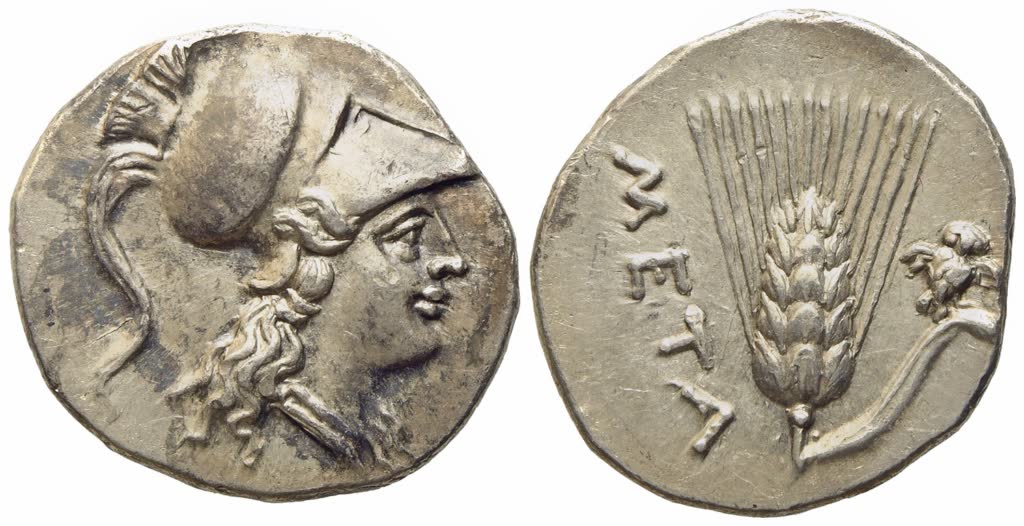 Head of Athena to right wearing crested Corinthian helmet, Rv. Ear of barley with leaf to right; owl in flight above leaf, META to left. HN Italy 1634; Robinson, Punic p. 50, 3; SNG ANS 549-50; Jameson 329. Near extremely fine / extremely fine.
