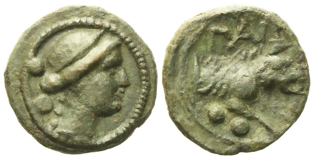Female head r.; two pellets to l.; Rv. Forepart of boar r.; two pellets below. Crawford, Paestum 12/1; HN Italy 1218. Green patina. Near extremely fine.