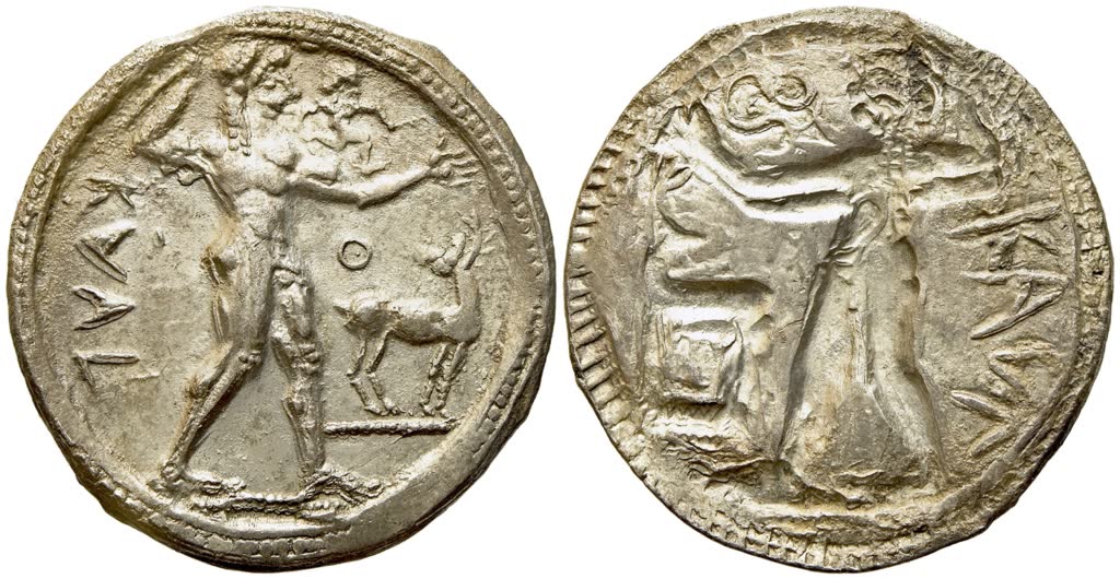 KAVΛ (retrograde), full-length figure of nude Apollo advancing right, torso turned facing, olive branch in raised right hand, small winged figure (daemon) atop extended left arm, running right and holding branch in each hand; O above stag standing right in right field, head reverted, dotted border on raised rim, Rv. Incuse of obverse, reversed, with ethnic and raised olive branch in relief in right hand; guilloche border on incuse band. HN Italy 2035. Good extremely fine.