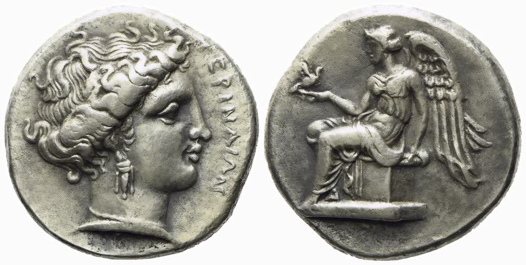 ΤΕΡΙΝΑΙΩΝ, head of nymph Terina r.; Rv. Nike seated l. on plinth, holding out r. hand upon which a small bird alights, l. hand resting on plinth. Regling, Terina 78; SNG Dewing 541; Holloway/Jenkins 84; HN Italy 2629; SNG ANS 852 (same obv. die); SNG Lloyd 761-2 (same obv. die); BMC 41 = GPCG p. 46, 25 (same obv. die); Basel 242; Gulbenkian 154 (same obv. die); Kraay-Hirmer pl. 97, 280. A very elegant portrait of exquisite style. Evidence of previous mechanical oxide removal. Fields gently smoothed. Probably slightly tooled around some figure details as a result of cleaning interventions, otherwise near extremely fine.