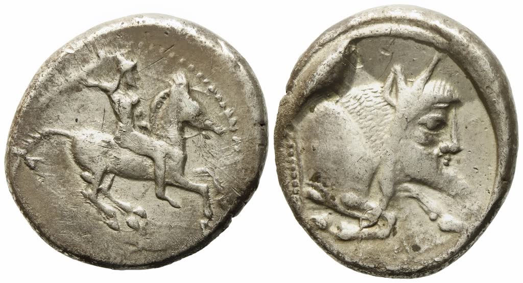 Warrior on horseback galloping right, preparing to cast javelin; Rv. [CEΛA], forepart of man-headed bull r. within circular incuse. SNG ANS 4. Good very fine.