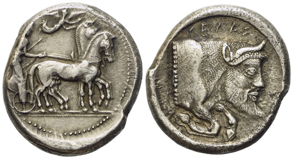 Charioteer, holding kentron in left hand and reins in right, driving quadriga right; above, Nike flying right, crowning horses with open wreath held in both hands; Rv. Forepart of bearded man-headed bull (river god) right; ΓEΛAΣ above; all within shallow incuse circle. Jenkins, Gela, Group II, 172; HGC 2, 338; SNG ANS 38. Refined style. Near extremely fine / extremely fine.
