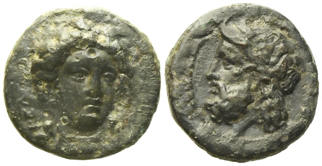 Wreathed head of Demeter facing slightly r.; Rv. Wreathed head of Gelas l. Jenkins, Gela, Group XII, 549; CNS 59; HGC 2, 388. Dark green patina. Good very fine / near extremely fine. Fine style.