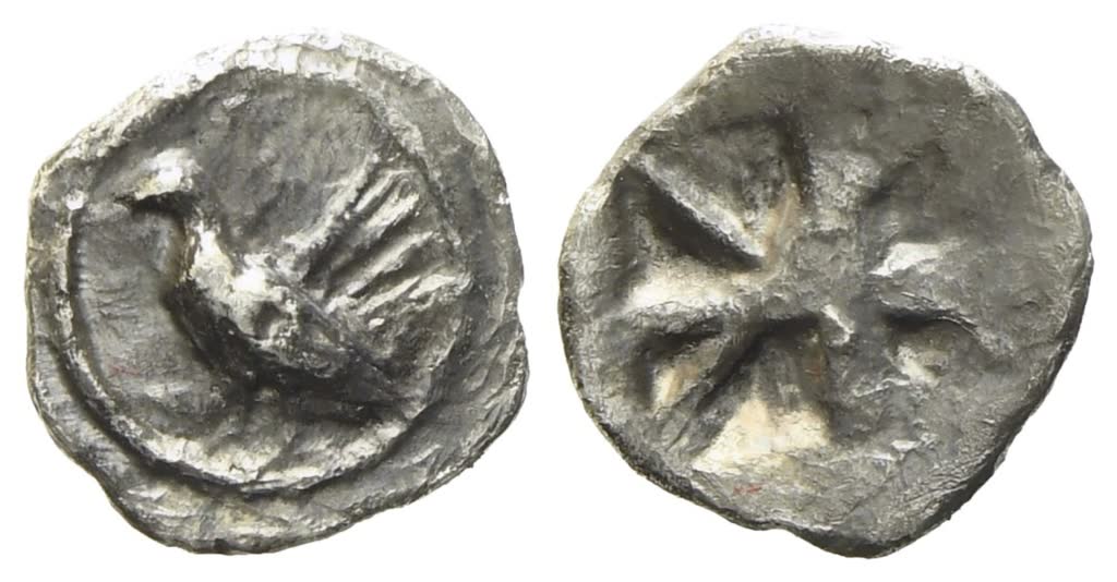 Cock standing right; Rv. Quadripartite incuse square, divided diagonally. Kraay 306; HGC 2, 430. Very rare. Good very fine.