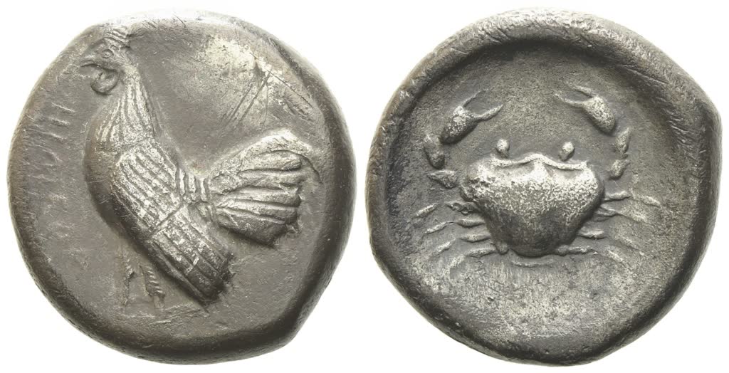 Cock standing l.; Rv. Crab. SNG ANS 163; HGC 2, 438. Good very fine / near extremely fine.