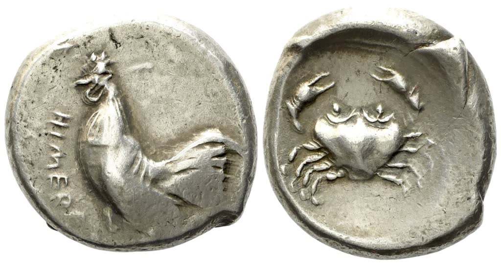 HIMERA, cockerel standing l.; Rv. Crab seen from above. Buceti 17; Westermark, Himera 93-95 var. (O14/R-); SNG ANS 155-163. Good very fine / about extremely fine.