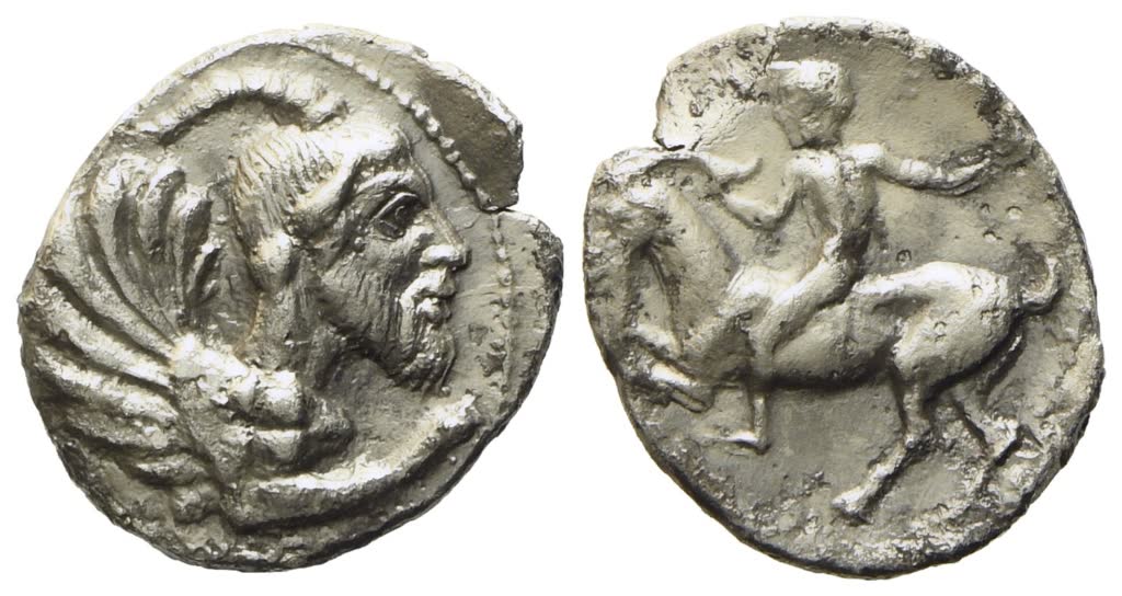 Forepart of a winged and horned, man-headed monster r.; Rv. Nude youth riding goat prancing l., holding goat's horn with left hand, and whip with right; [IMEPAION] around. SNG ANS 174; SNG Munich 354; SNG Copenhagen 310; Buceti 39. Very rare. Porosity. Flan slightly bent, otherwise extremely fine.
