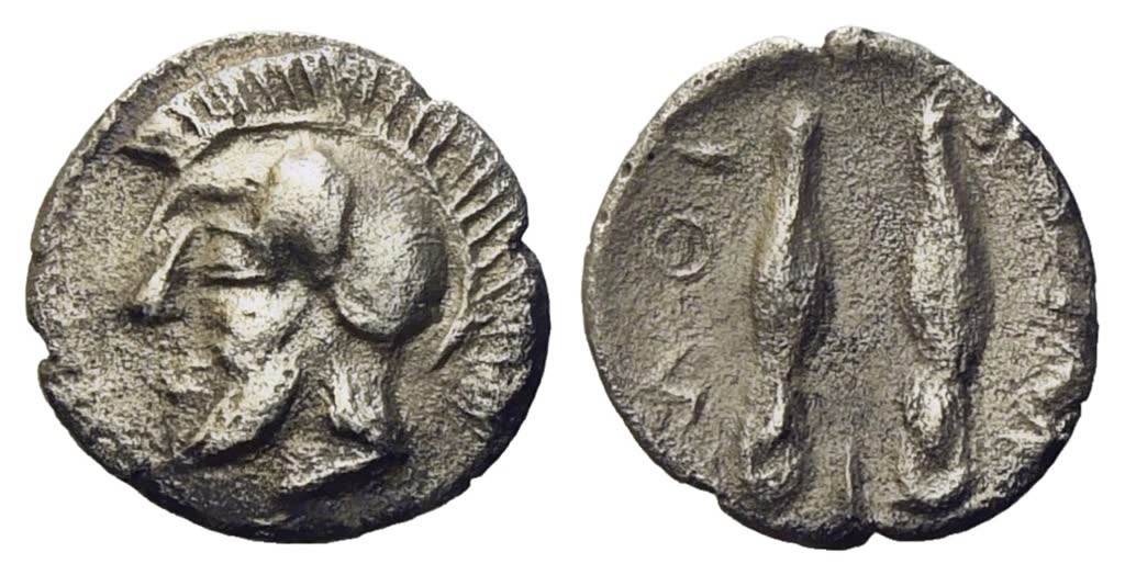 Male head with beard and crested helmet l.; dotted border; Rv. Two greaves, IMEPAION around. Buceti 47; BMC 2, 45; Hirmer-Kraay 817. Porosity. Near extremely fine.