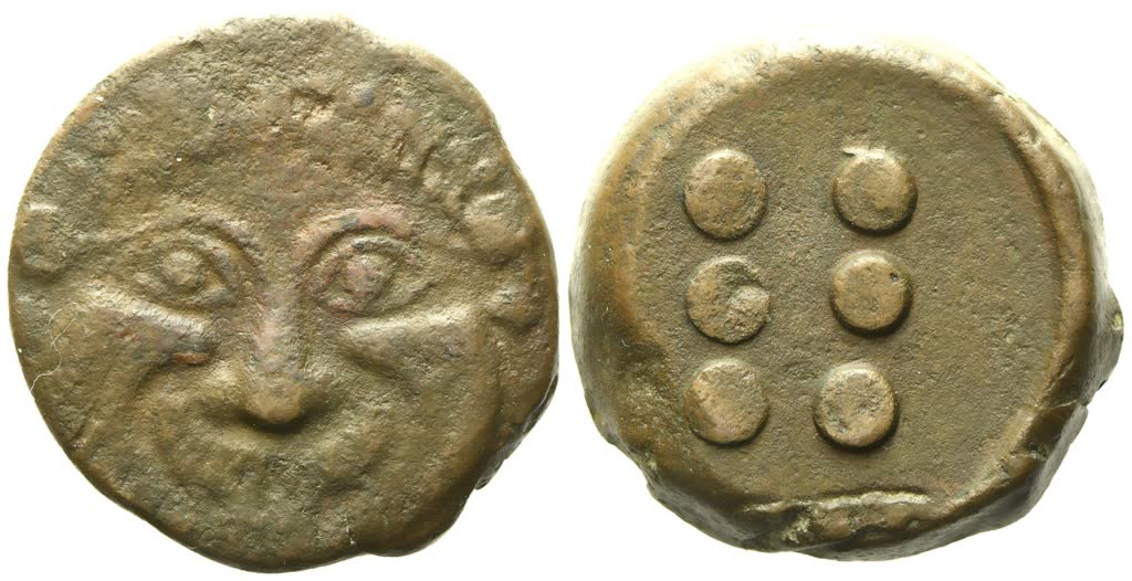 Facing gorgoneion, with tongue protruding; Rv. Six pellets (mark of value). CNS 24; HGC 2, 472. Pleasing brown tone. Very fine / good extremely fine.