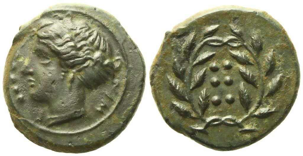 IM – E, head of nymph l., hair in band; six pellets (mark of value) before; Rv. Six pellets (mark of value) within wreath. Kraay, Bronze, group b, 3; CNS 35; SNG ANS 186; HGC 2, 479. Glossy brown patina. Good extremely fine / FDC.