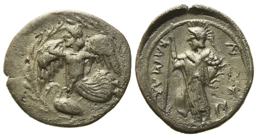 Nike flying l., swan below; Rv. KAMAR – INAION, Athena standing l., holding spear. Jenkins 88; SNG Copenhagen 158-160; SNG ANS 1212. Good extremely fine. Fine style.