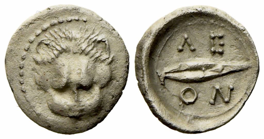 Facing lion's scalp, Rv. ΛΕ-ΟΝ, barley grain. Hirmer-Kraay 828; SNG ANS 213. Extremely fine. Slight porosity.